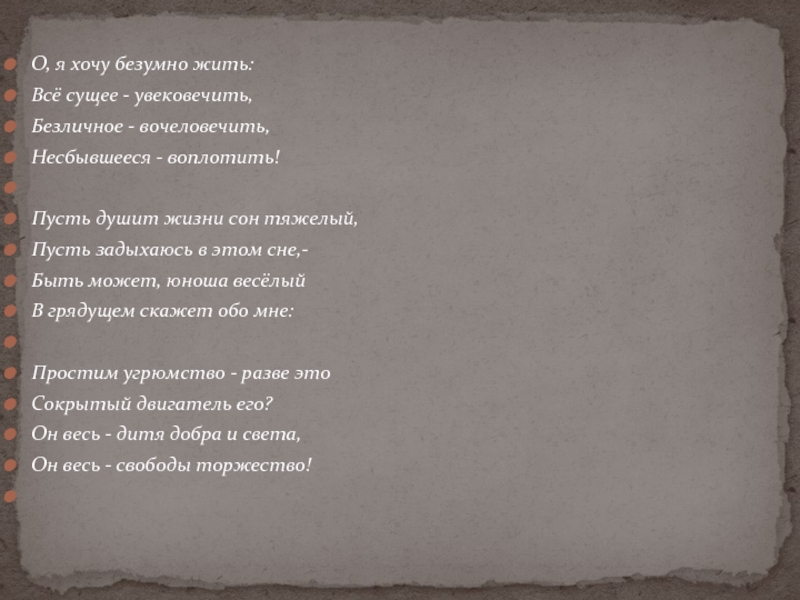 Слайд 42О, я хочу безумно жить: