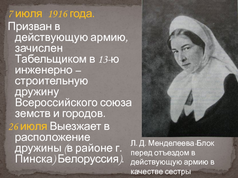 Л. Д. Менделеева-Блок перед отъездом в действующую армию в качестве сестры милосердия.