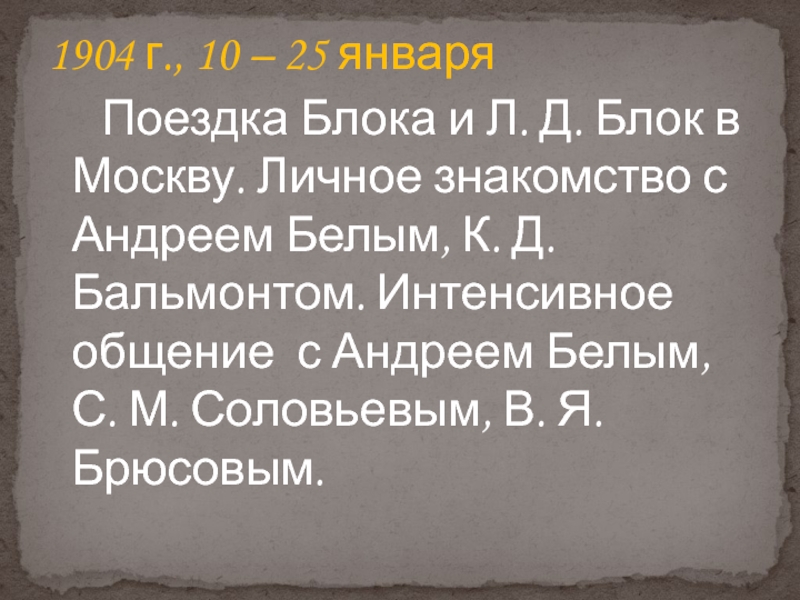 Л. Д. Блок в Москву. Личное знакомство с Андреем Белым, К. Д. Бальмонтом. Интенсивное общение с Андреем Белым, С. М. Соловьевым, В. Я. Брюсовым.