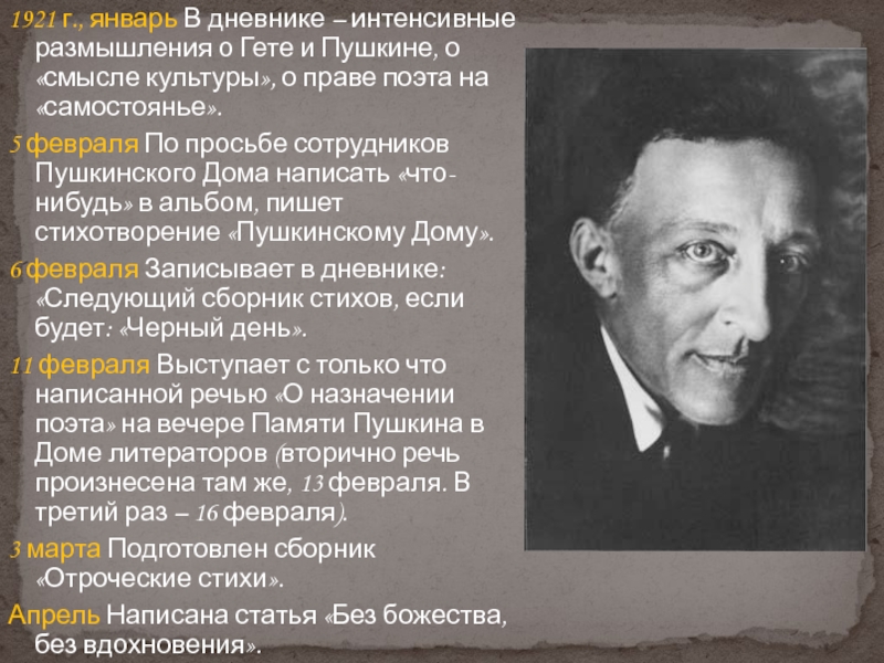 Слайд 381921 г., январь В дневнике – интенсивные размышления о Гете и