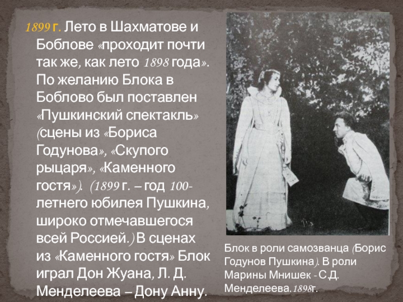 как лето 1898 года». По желанию Блока в Боблово был поставлен «Пушкинский спектакль» (сцены из «Бориса Годунова», «Скупого рыцаря», «Каменного гостя»). (1899 г. – год 100-летнего юбилея Пушкина, широко отмечавшегося всей Россией.) В сценах из «Каменного гостя» Блок играл Дон Жуана, Л. Д. Менделеева – Дону Анну.