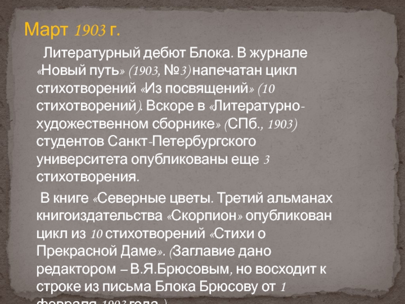 В книге «Северные цветы. Третий альманах книгоиздательства «Скорпион» опубликован цикл из 10 стихотворений «Стихи о Прекрасной Даме». (Заглавие дано редактором – В.Я.Брюсовым, но восходит к строке из письма Блока Брюсову от 1 февраля 1903 года.)