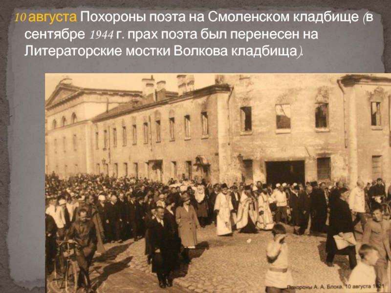 Слайд 4110 августа Похороны поэта на Смоленском кладбище (в сентябре 1944 г.