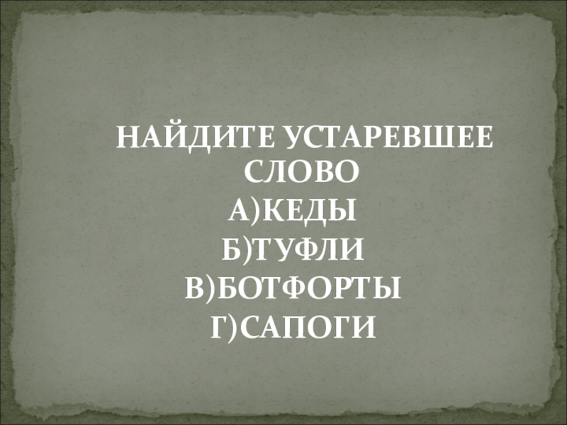 НАЙДИТЕ УСТАРЕВШЕЕ СЛОВОА)КЕДЫБ)ТУФЛИВ)БОТФОРТЫГ)САПОГИ