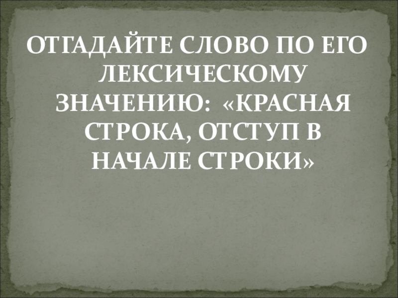 Слайд 7ОТГАДАЙТЕ СЛОВО ПО ЕГО ЛЕКСИЧЕСКОМУ ЗНАЧЕНИЮ: «КРАСНАЯ СТРОКА, ОТСТУП В НАЧАЛЕ