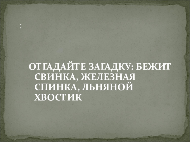 Слайд 41ОТГАДАЙТЕ ЗАГАДКУ: БЕЖИТ СВИНКА, ЖЕЛЕЗНАЯ СПИНКА, ЛЬНЯНОЙ ХВОСТИК
