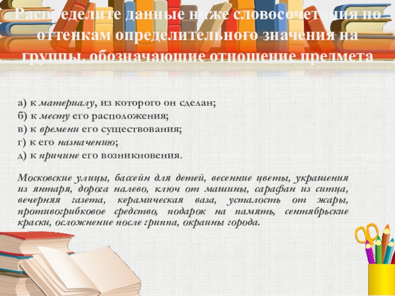 Московские улицы, бассейн для детей, весенние цветы, украшения из янтаря, дорога налево, ключ от машины, сарафан из ситца, вечерняя газета, керамическая ваза, усталость от жары, противогрибковое средство, подарок на память, сентябрьские краски, осложнение после гриппа, окраины города.