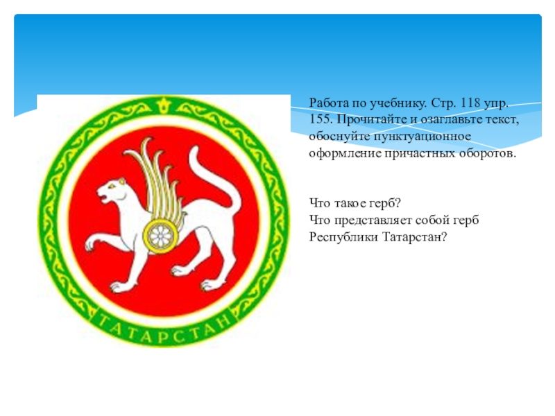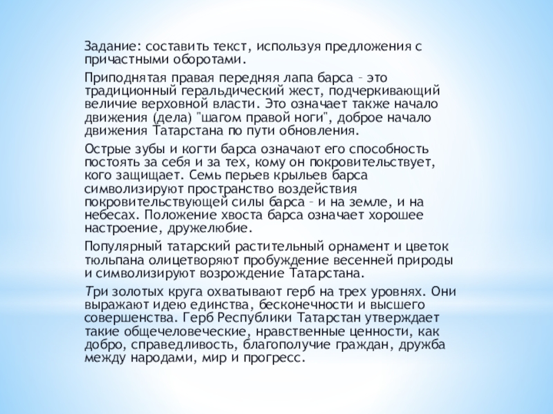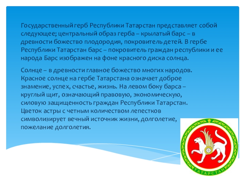 Солнце – в древности главное божество многих народов. Красное солнце на гербе Татарстана означает доброе знамение, успех, счастье, жизнь. На левом боку барса – круглый щит, означающий правовую, экономическую, силовую защищенность граждан Республики Татарстан. Цветок астры с четным количеством лепестков символизирует вечный источник жизни, долголетие, пожелание долголетия.