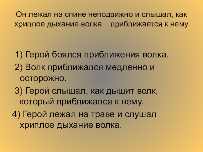 4) Герой лежал на траве и слушал хриплое дыхание волка.