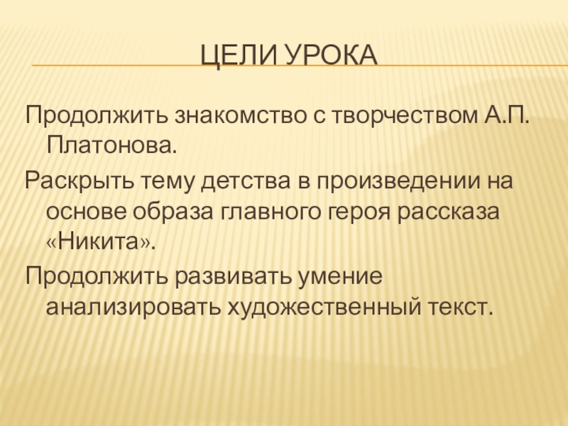 Цели урокаПродолжить знакомство с творчеством А.П.Платонова.Раскрыть тему детства в произведении на основе образа главного героя рассказа «Никита».Продолжить