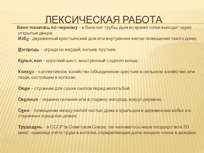 трубы, дым во время топки выходит через открытые двери; Изба– деревянный крестьянский дом или внутреннее жилое помещение такого дома; Изгородь – ограда из жердей, кольев, прутьев; Колья, кол – короткий шест, заостренный с одного конца; Колхоз – коллективное хозяйство (объединение крестьян в сельском хозяйстве) или люди, состоящие в колхозе; Овин – строение для сушки снопов перед молотьбой; Околица – окраина селения или в старину: изгородь вокруг деревни; Сени – помещение между жилой частью дома и крыльцом в деревенских избах и в старинных городских домах;  Трудодень – в СССР (в Советском Союзе, так называлось наше государство в 20 веке) –единица учёта труда в колхозе, определяющая долю каждого члена в доходах;