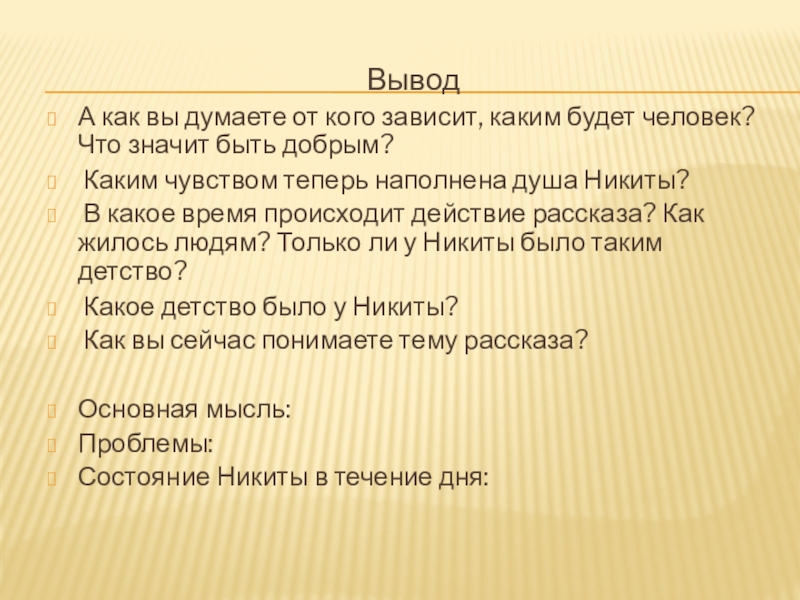 ВыводА как вы думаете от кого зависит, каким будет человек? Что значит быть добрым? Каким чувством теперь
