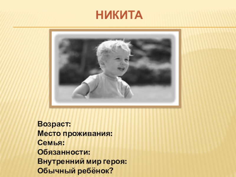 НикитаВозраст:Место проживания: Семья:Обязанности:Внутренний мир героя:Обычный ребёнок?