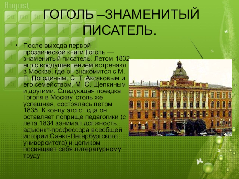 писатель. Летом 1832 его с воодушевлением встречают в Москве, где он знакомится с М. П. Погодиным, С. Т. Аксаковым и его семейством, М. С. Щепкиным и другими. Следующая поездка Гоголя в Москву, столь же успешная, состоялась летом 1835. К концу этого года он оставляет поприще педагогики (с лета 1834 занимал должность адъюнкт-профессора всеобщей истории Санкт-Петербургского университета) и целиком посвящает себя литературному труду