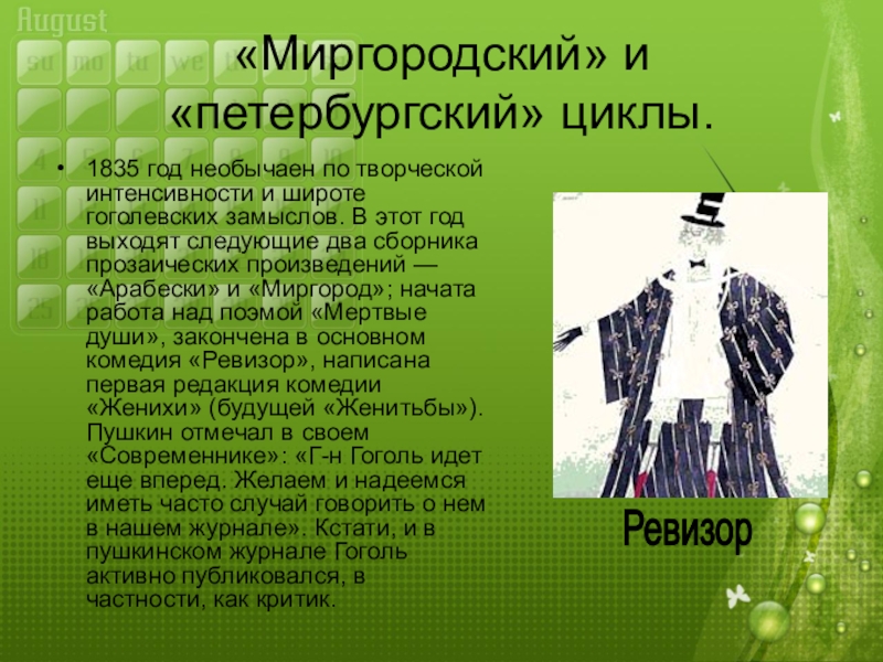 широте гоголевских замыслов. В этот год выходят следующие два сборника прозаических произведений — «Арабески» и «Миргород»; начата работа над поэмой «Мертвые души», закончена в основном комедия «Ревизор», написана первая редакция комедии «Женихи» (будущей «Женитьбы»). Пушкин отмечал в своем «Современнике»: «Г-н Гоголь идет еще вперед. Желаем и надеемся иметь часто случай говорить о нем в нашем журнале». Кстати, и в пушкинском журнале Гоголь активно публиковался, в частности, как критик.