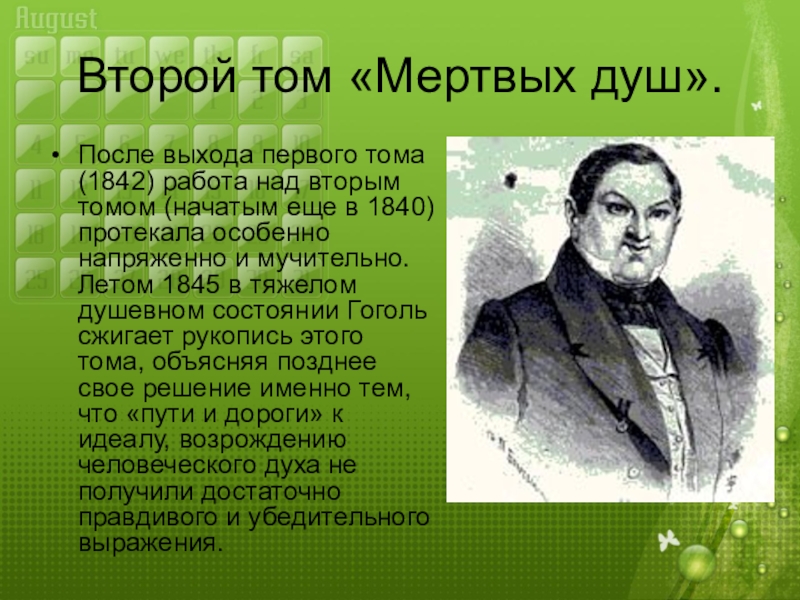 вторым томом (начатым еще в 1840) протекала особенно напряженно и мучительно. Летом 1845 в тяжелом душевном состоянии Гоголь сжигает рукопись этого тома, объясняя позднее свое решение именно тем, что «пути и дороги» к идеалу, возрождению человеческого духа не получили достаточно правдивого и убедительного выражения.