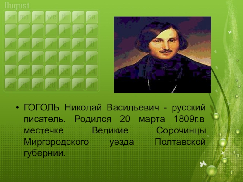 Слайд 2ГОГОЛЬ Николай Васильевич - русский писатель. Родился 20 марта 1809г.в местечке