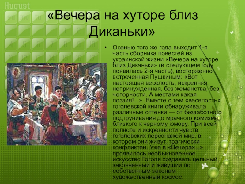 сборника повестей из украинской жизни «Вечера на хуторе близ Диканьки» (в следующем году появилась 2-я часть), восторженно встреченная Пушкиным: «Вот настоящая веселость, искренняя, непринужденная, без жеманства, без чопорности. А местами какая поэзия!...». Вместе с тем «веселость» гоголевской книги обнаруживала различные оттенки — от беззаботного подтрунивания до мрачного комизма, близкого к черному юмору. При всей полноте и искренности чувств гоголевских персонажей мир, в котором они живут, трагически конфликтен. Уже в «Вечерах...» проявилось необыкновенное искусство Гоголя создавать цельный, законченный и живущий по собственным законам художественный космос.