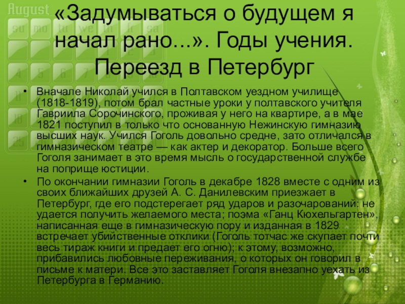 Николай учился в Полтавском уездном училище (1818-1819), потом брал частные уроки у полтавского учителя Гавриила Сорочинского, проживая у него на квартире, а в мае 1821 поступил в только что основанную Нежинскую гимназию высших наук. Учился Гоголь довольно средне, зато отличался в гимназическом театре — как актер и декоратор. Больше всего Гоголя занимает в это время мысль о государственной службе на поприще юстиции.