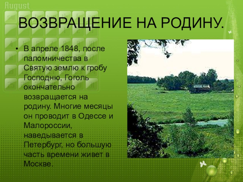 гробу Господню, Гоголь окончательно возвращается на родину. Многие месяцы он проводит в Одессе и Малороссии, наведывается в Петербург, но большую часть времени живет в Москве.