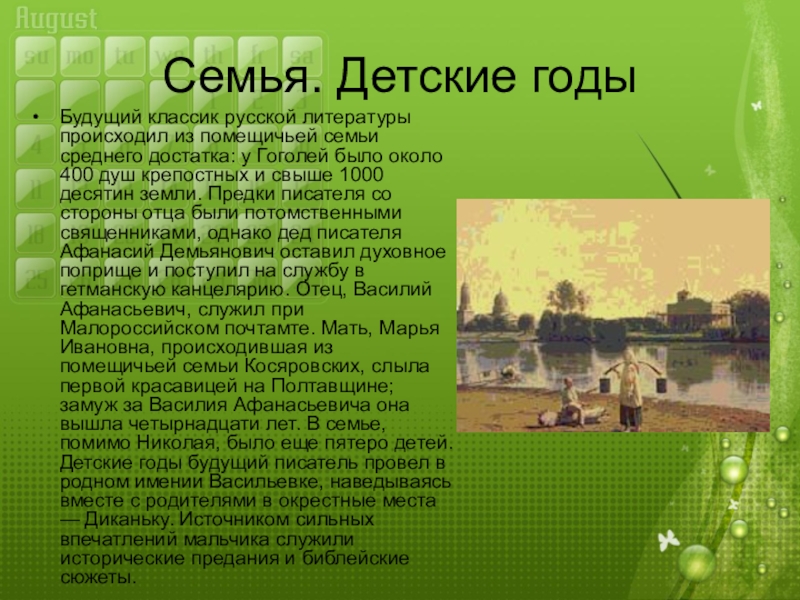 достатка: у Гоголей было около 400 душ крепостных и свыше 1000 десятин земли. Предки писателя со стороны отца были потомственными священниками, однако дед писателя Афанасий Демьянович оставил духовное поприще и поступил на службу в гетманскую канцелярию. Отец, Василий Афанасьевич, служил при Малороссийском почтамте. Мать, Марья Ивановна, происходившая из помещичьей семьи Косяровских, слыла первой красавицей на Полтавщине; замуж за Василия Афанасьевича она вышла четырнадцати лет. В семье, помимо Николая, было еще пятеро детей. Детские годы будущий писатель провел в родном имении Васильевке, наведываясь вместе с родителями в окрестные места — Диканьку. Источником сильных впечатлений мальчика служили исторические предания и библейские сюжеты.