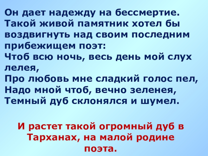 поклониться праху великого русского гения. И дуб шумит листвой над тарханскими тропинками, над озером, словно вечный сторож печальных мест. Вновь слагают здесь стихи поэты: