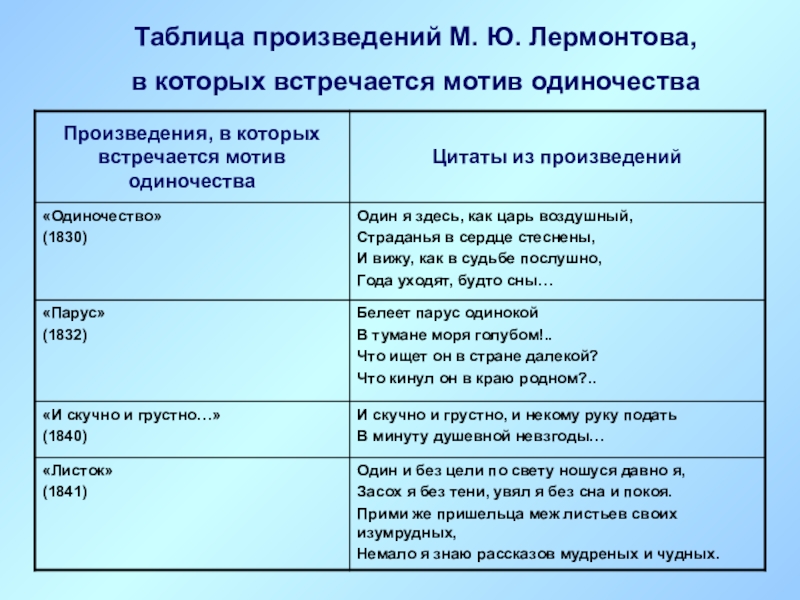 Слайд 19Таблица произведений М. Ю. Лермонтова,