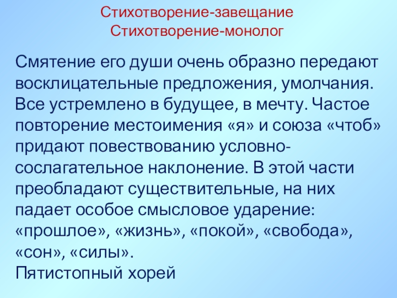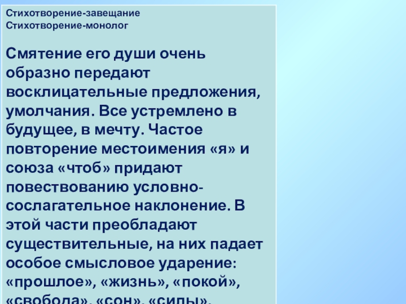 в будущее, в мечту. Частое повторение местоимения «я» и союза «чтоб» придают повествованию условно-сослагательное наклонение. В этой части преобладают существительные, на них падает особое смысловое ударение: «прошлое», «жизнь», «покой», «свобода», «сон», «силы».