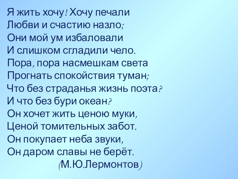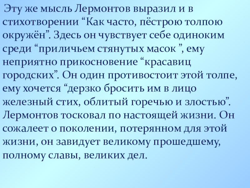 Слайд 7 Эту же мысль Лермонтов выразил и в стихотворении “Как часто,