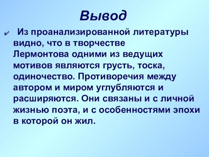 мотивов являются грусть, тоска, одиночество. Противоречия между автором и миром углубляются и расширяются. Они связаны и с личной жизнью поэта, и с особенностями эпохи в которой он жил.