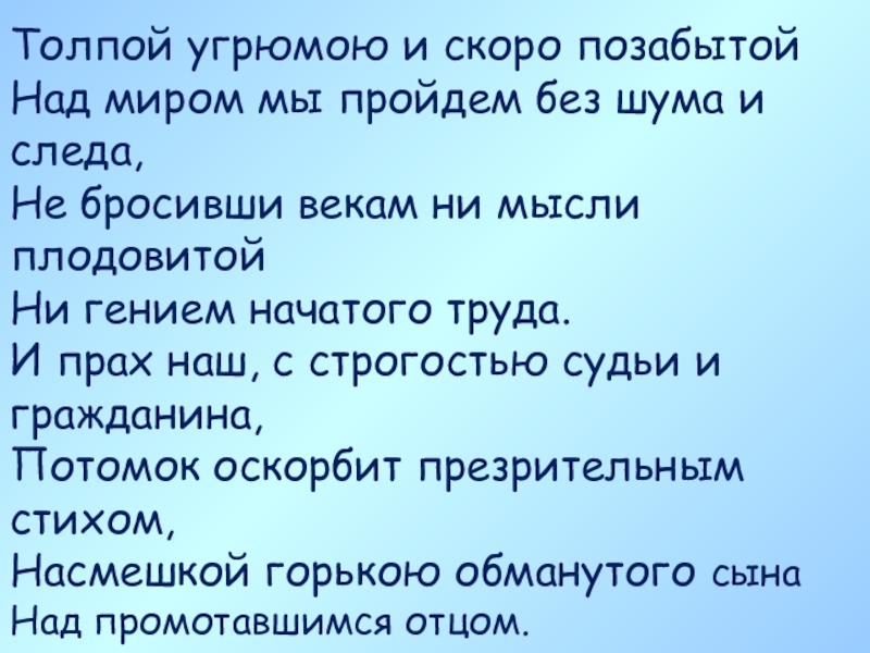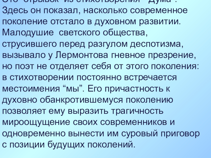 Слайд 6Это отрывок из стихотворения "Дума". Здесь он показал, насколько современное поколение