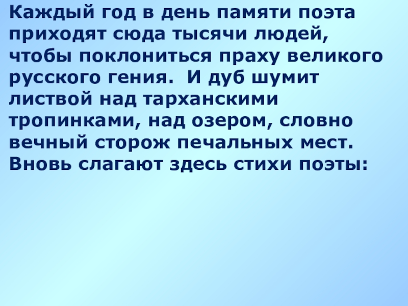 Слайд 37Каждый год в день памяти поэта приходят сюда тысячи людей, чтобы