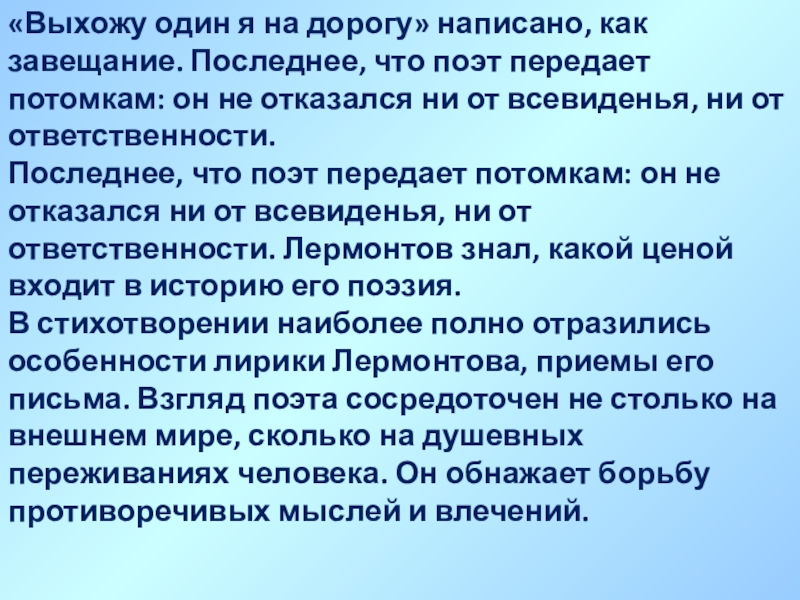 Слайд 27«Выхожу один я на дорогу» написано, как завещание. Последнее, что поэт
