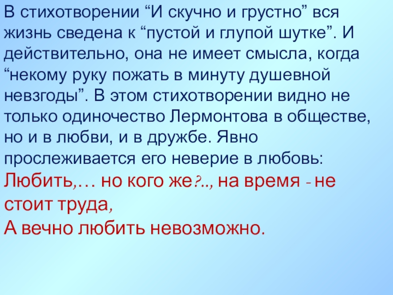 и глупой шутке”. И действительно, она не имеет смысла, когда “некому руку пожать в минуту душевной невзгоды”. В этом стихотворении видно не только одиночество Лермонтова в обществе, но и в любви, и в дружбе. Явно прослеживается его неверие в любовь: