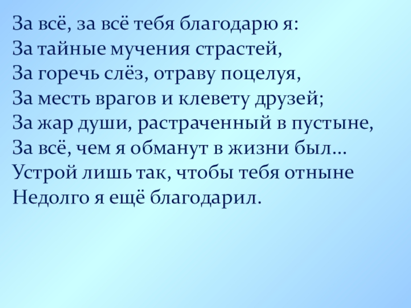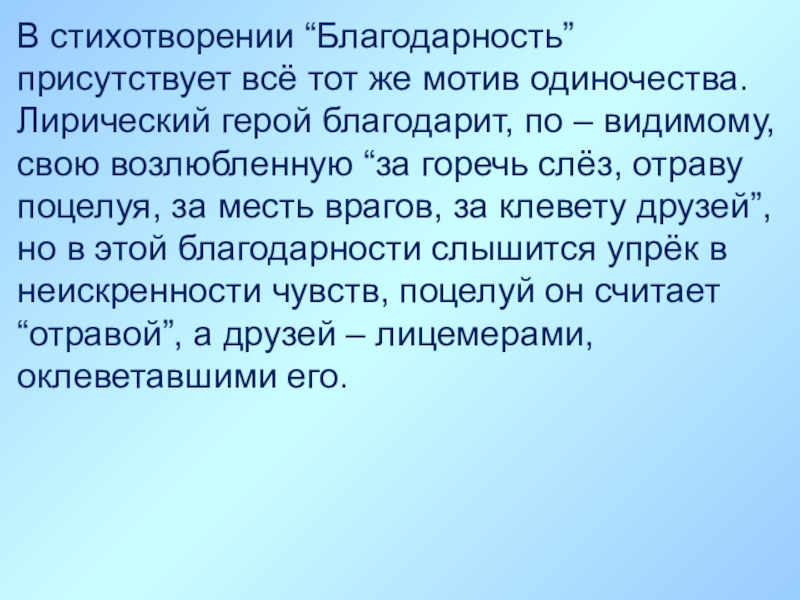 благодарит, по – видимому, свою возлюбленную “за горечь слёз, отраву поцелуя, за месть врагов, за клевету друзей”, но в этой благодарности слышится упрёк в неискренности чувств, поцелуй он считает “отравой”, а друзей – лицемерами, оклеветавшими его.