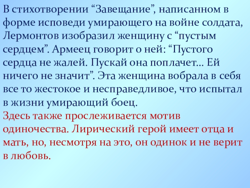 Слайд 12В стихотворении “Завещание”, написанном в форме исповеди умирающего на войне солдата,