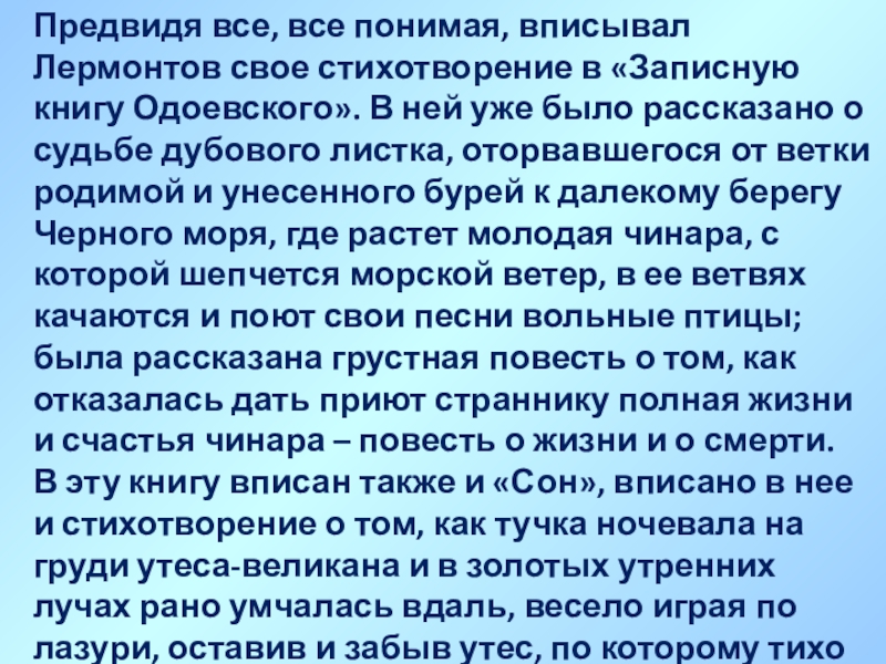 Одоевского». В ней уже было рассказано о судьбе дубового листка, оторвавшегося от ветки родимой и унесенного бурей к далекому берегу Черного моря, где растет молодая чинара, с которой шепчется морской ветер, в ее ветвях качаются и поют свои песни вольные птицы; была рассказана грустная повесть о том, как отказалась дать приют страннику полная жизни и счастья чинара – повесть о жизни и о смерти.