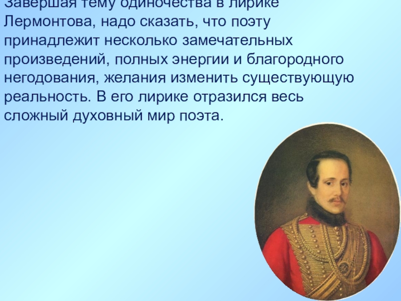 Слайд 42Завершая тему одиночества в лирике Лермонтова, надо сказать, что поэту принадлежит