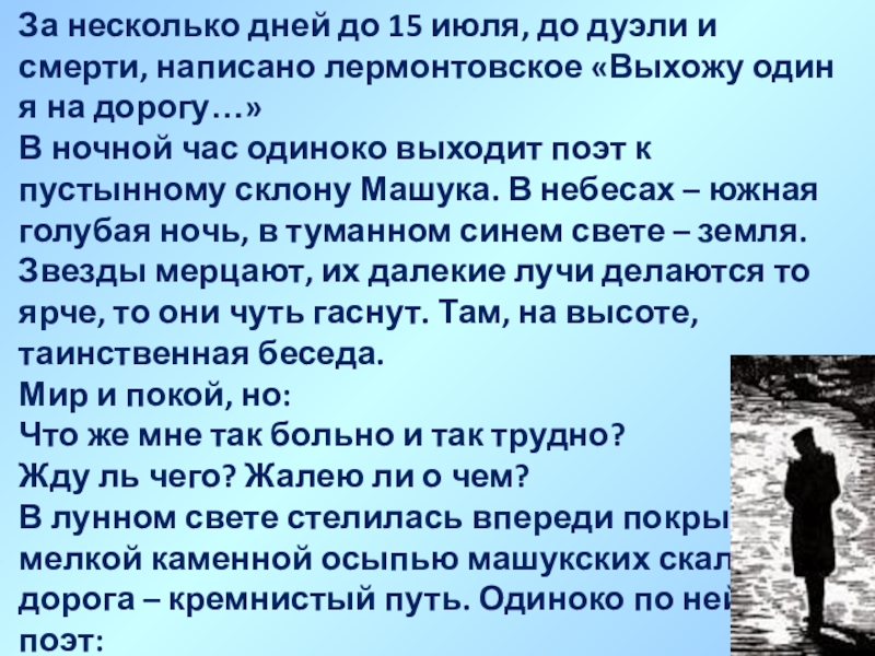 Слайд 25«Выхожу один я на дорогу…», принадлежащем «к лучшим созданиям Лермонтова». Поэт