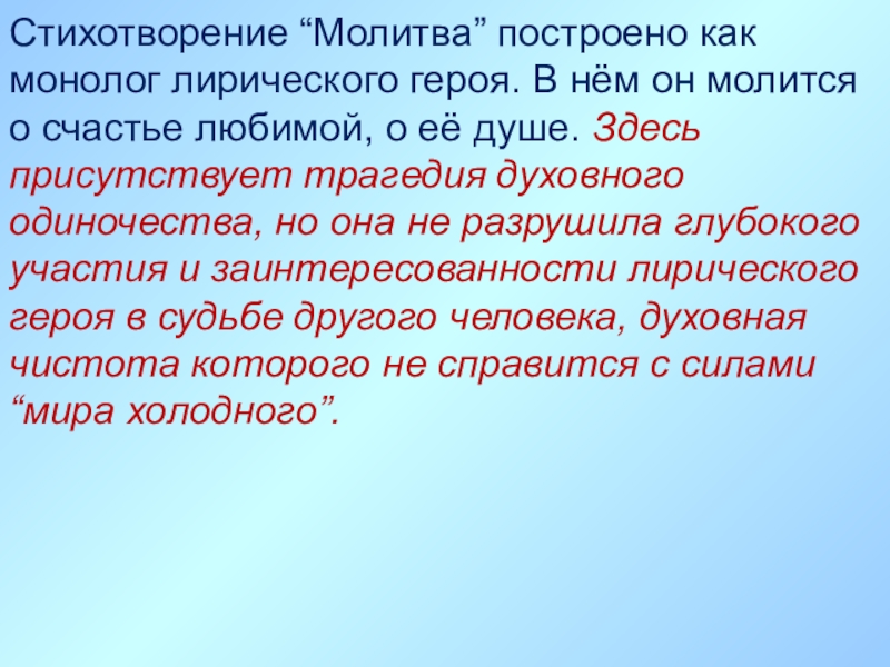 Слайд 14Стихотворение “Молитва” построено как монолог лирического героя. В нём он молится