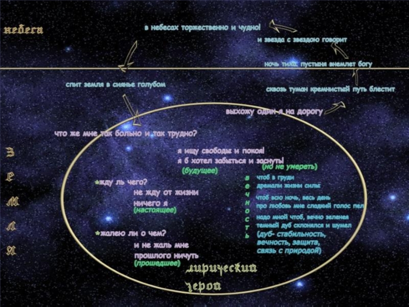 взволнован величием ночи, очарован торжественной тишиной и покоем, разлитым в природе. Это настроение передается и нам, читателям. Мы видим и «кремнистый путь», и «сиянье голубое», и яркие звезды, ощущаем торжественную тишину ночи. Это гимн красоте, гармонии свободной и могучей природы, не знающей противоречий.