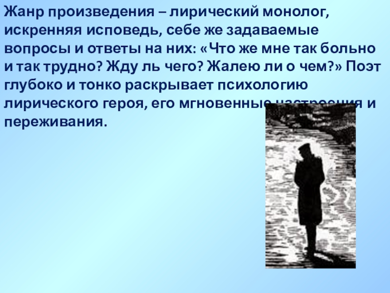 Слайд 28Жанр произведения – лирический монолог, искренняя исповедь, себе же задаваемые вопросы