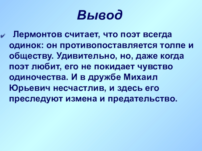 Лермонтов считает, что поэт всегда одинок: он противопоставляется толпе и обществу.