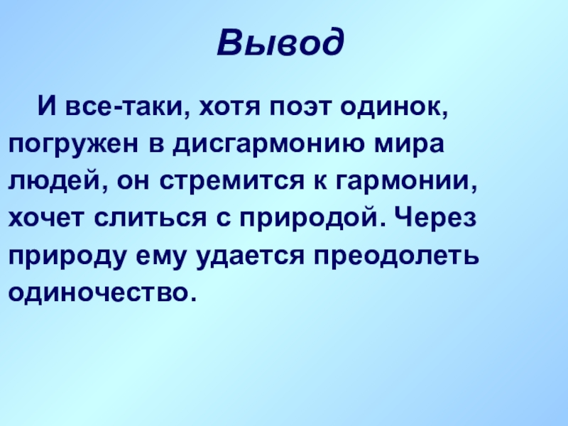 стремится к гармонии, хочет слиться с природой. Через природу ему удается преодолеть одиночество.