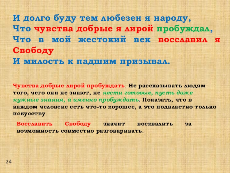 Чувства добрые лирой пробуждать. Не рассказывать людям того, чего они не знают, не нести готовые, пусть даже нужные знания, а именно пробуждать. Показать, что в каждом человеке есть что-то хорошее, а это подвластно только искусству.