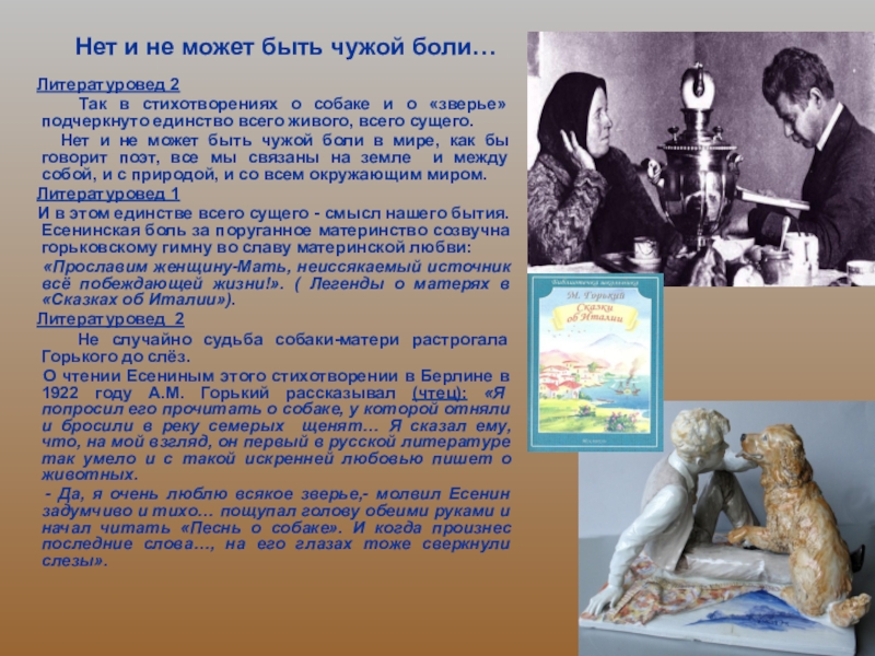 - Да, я очень люблю всякое зверье,- молвил Есенин задумчиво и тихо… пощупал голову обеими руками и начал читать «Песнь о собаке». И когда произнес последние слова…, на его глазах тоже сверкнули слезы».