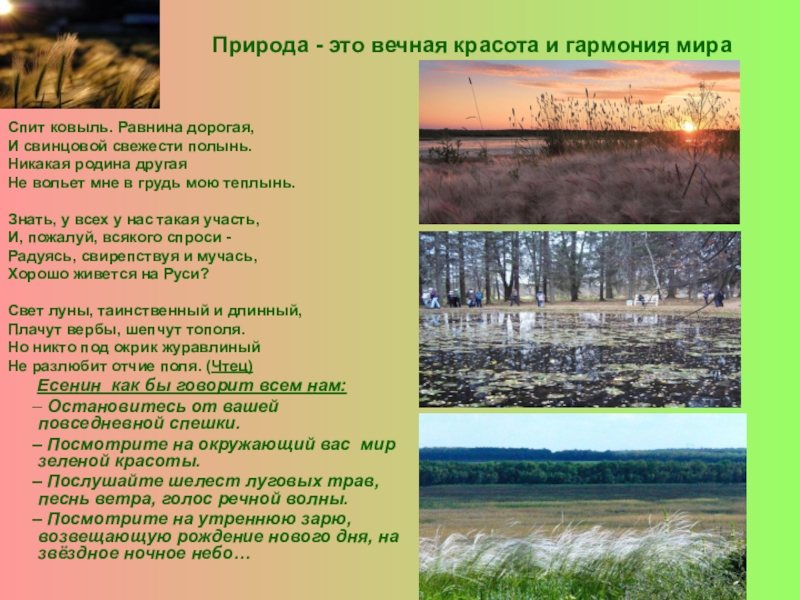 – Послушайте шелест луговых трав, песнь ветра, голос речной волны.