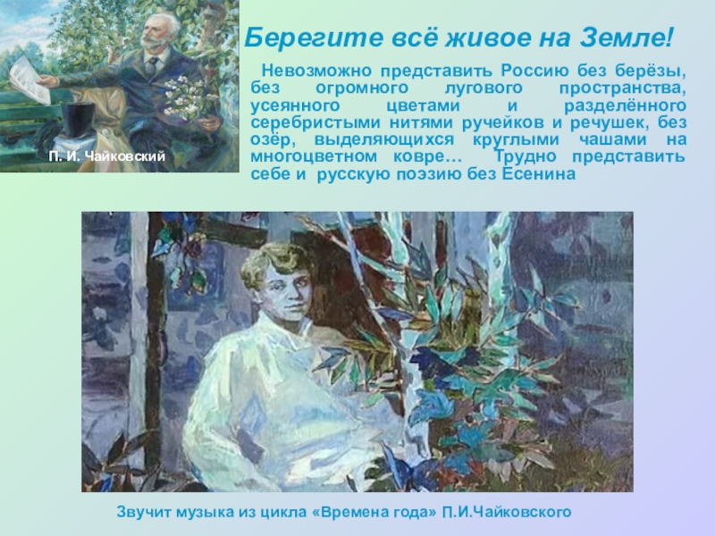 без берёзы, без огромного лугового пространства, усеянного цветами и разделённого серебристыми нитями ручейков и речушек, без озёр, выделяющихся круглыми чашами на многоцветном ковре… Трудно представить себе и русскую поэзию без Есенина