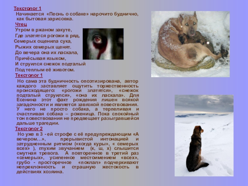 Но сама эта будничность опоэтизирована, автор каждого заставляет ощутить торжественность происходящего: «рогожи златятся», «снежок подталый струился», «она их ласкала». Для Есенина этот факт рождения лишен всякой загадочности и является завязкой повествования. У него не просто собака, а терпеливая и счастливая собака – роженица. Пока спокойный тон повествования не предвещает разыгравшейся дальше трагедии.