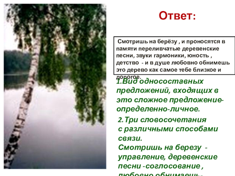 Смотришь на березу -управление, деревенские песни -соглосование ,любовно обнимаешь-примыкание.